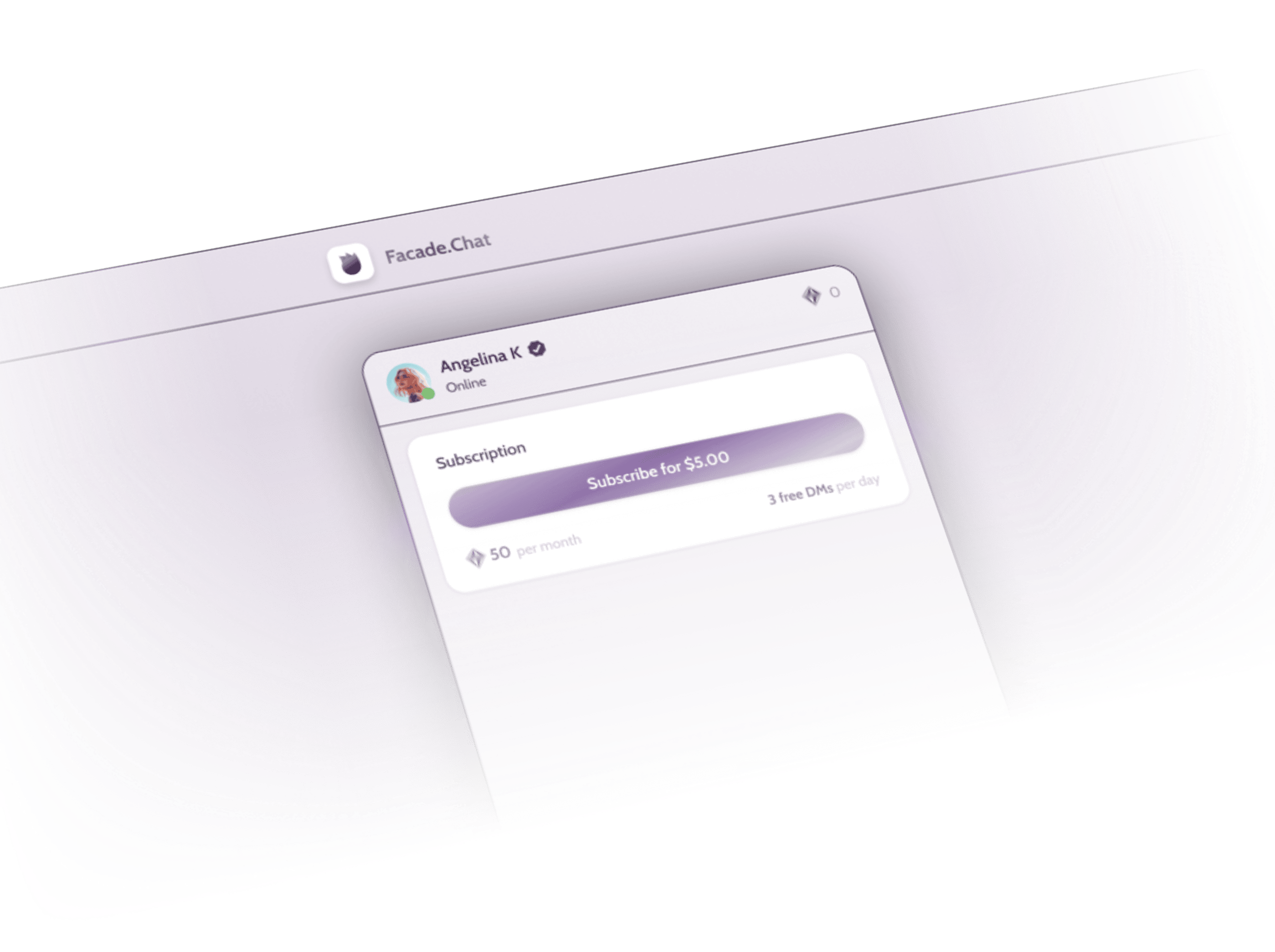 Build and share your Facade profile page. Here you can sell chat access through subscriptions and gems.